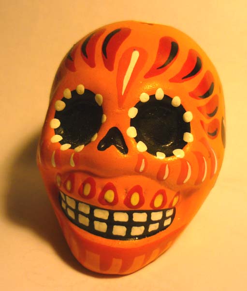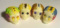 | Candy skulls are probably the single item most associated with Dia de los Muertos. Typically made from a spun sugar called alfenique, these little skulls might have a name written on them, or be decorated with glitter or sequins. They come in a variety of sizes, from about ping pong ball-sized up to about the size of grapefruits, and you can also purchase molds and instructions to make your own. These were purchased at the 2011 Olvera Street Dia de los Muertos celebration. |