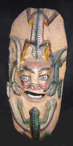 Another mask that supposedly was used for Dia de los Muertos. I'm sure there's some meaning to the lizards on the face, but I haven't yet deciphered it. This wooden mask is about the size of an eight-year-old child. |