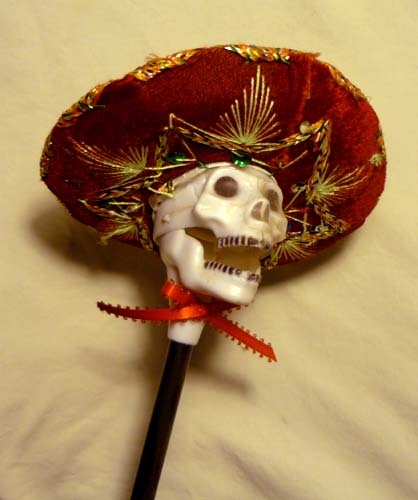 | Dia de los Muertos folk art often depicts little skeleton figures going about their daily tasks. Here's a skeleton widow visiting her late husband's grave (this is smaller than my fist). |